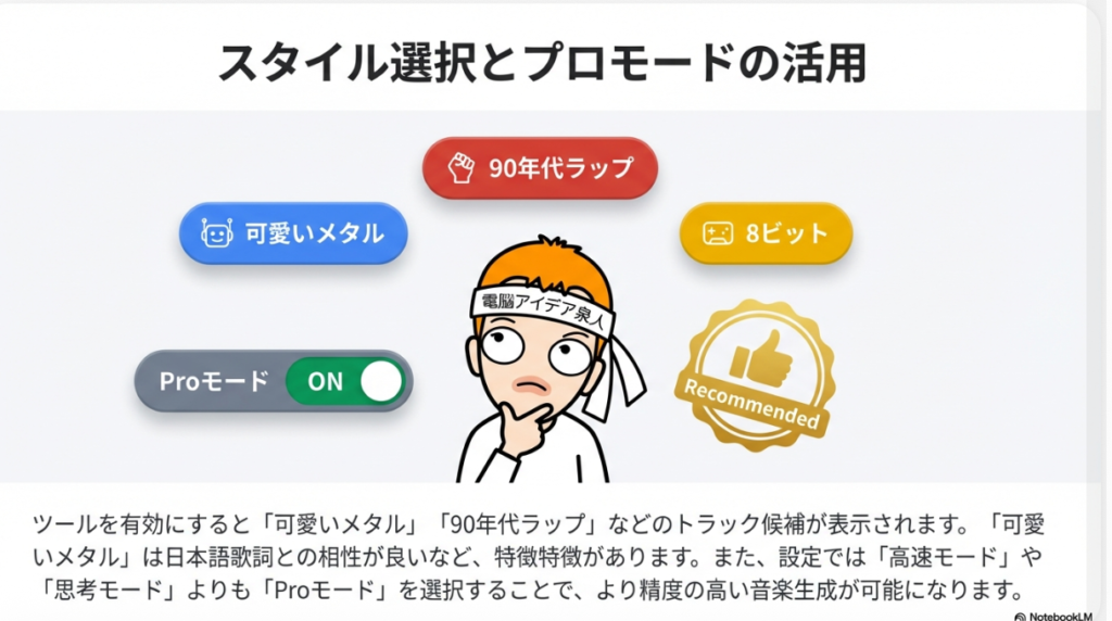 | 生成モード | Proモード推奨 | 「高速」や「思考」より時間はかかるが、メロディの精度が格段に高い。 |