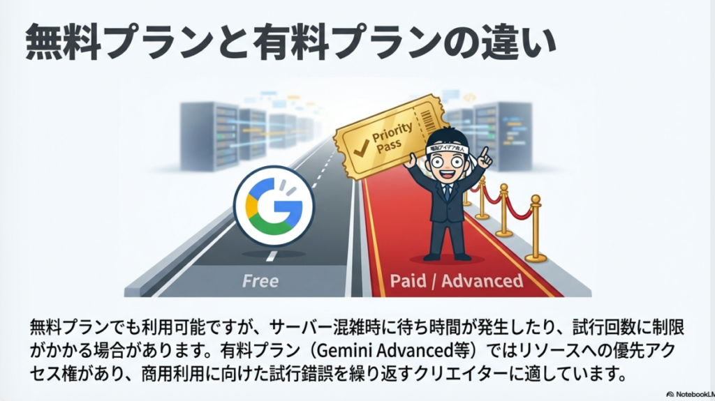 🆓 無料プラン vs 有料プラン 無料プランでも音楽生成機能を利用できるが、サーバー混雑時の待ち時間や試行回数に制限がある。有料プランではリソースへの優先アクセスが付与され生成制限が大幅に緩和されるため、BGMを納得いくまで繰り返し作りたいクリエイターや商用目的のユーザーには有料プランが推奨される。