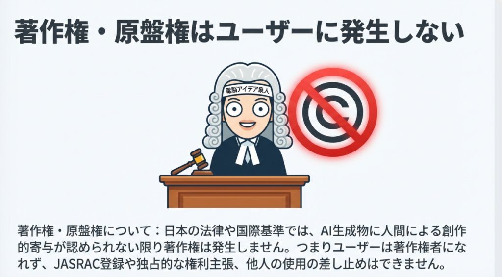 | 📜 著作権 | 原則として発生しない。プロンプト入力者も著作権者にはなれない(日本法・国際基準) |