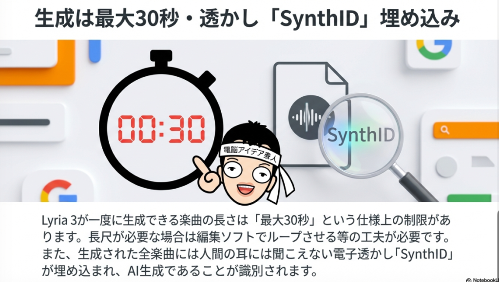 ⏱️ 30秒制限 Lyria 3が一度に生成できる楽曲の最大長さは30秒という仕様上の制約。長尺のBGMが必要な場合は、生成した30秒トラックを動画・音声編集ソフトでループ再生するなどの工夫が必要になる。現状の音楽AIサービス全般に共通する課題の一つでもある。