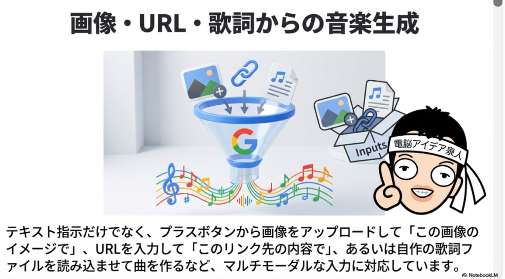 🖼️ マルチモーダル入力 テキストだけでなく、写真・URL・既存の歌詞ファイルなど複数の形式の情報をGeminiに与えて音楽生成に活用できる機能。「プロフィール写真に合う曲」「URLで紹介している商品のプロモーション曲」など多彩な用途が可能で、他の専門音楽生成サービスにはないインターフェイスの強みとなっている。