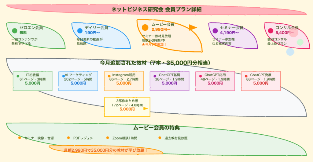 🎬 ムービー会員 月額2990円でセミナー映像が見放題となる会員プラン。毎月1本以上の新しい教材がリリースされ、過去の動画や音源にもアクセス可能。さらにデイリー会員の動画も視聴でき、コストパフォーマンスに優れた学習プランとして位置づけられている。