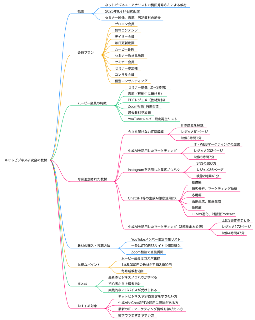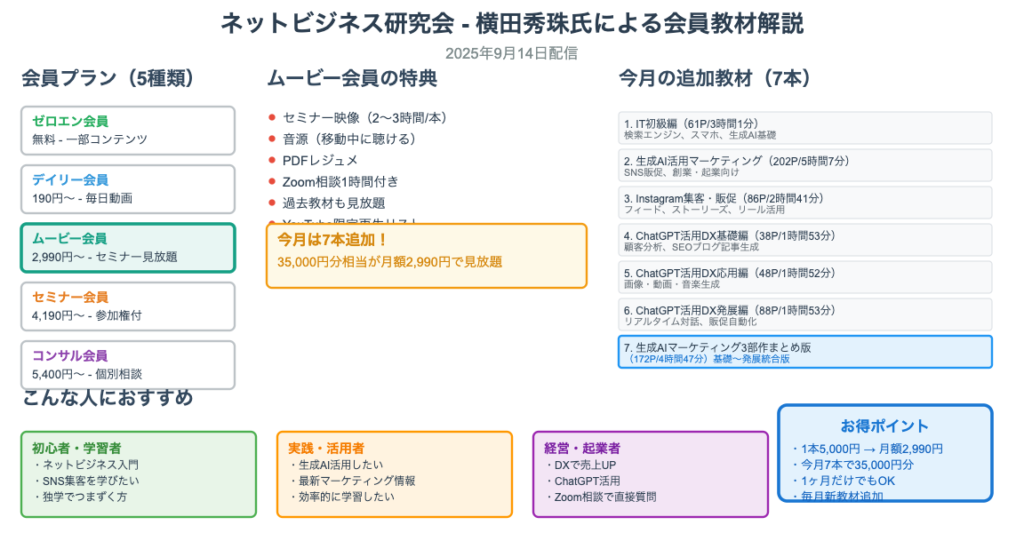 🎓 ネットビジネス研究会 横田秀珠氏が運営するオンライン学習プラットフォーム。無料から月5400円まで5つの会員プランを提供し、IT・マーケティング・生成AIなどビジネスに必要なスキルを体系的に学べる。現在142のテーマを教材として展開し、継続的にコンテンツを更新している包括的な学習サービス。