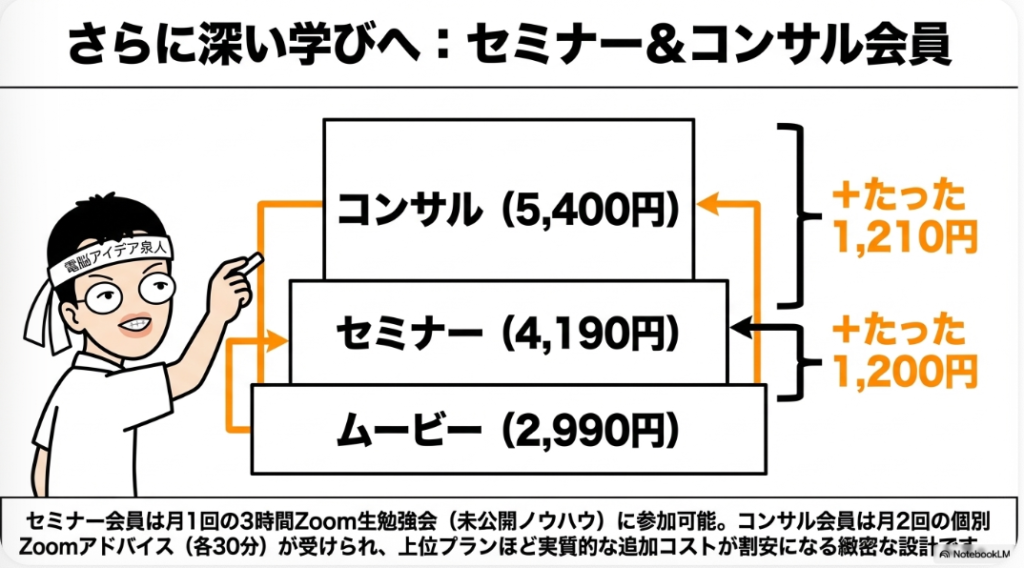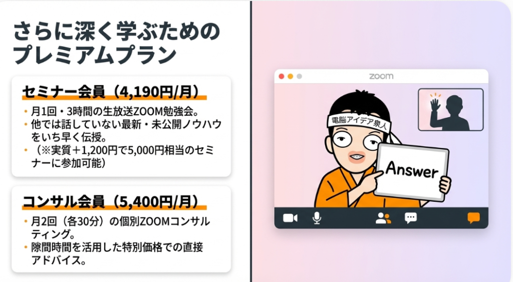 🎓 セミナー会員 月額4,190円で、月1回開催されるZOOMオンライン勉強会に参加できるプランです。3時間にわたり、他では未公開の最新ノウハウがいち早く共有されます。参加者との双方向の質疑応答も可能で、アーカイブも残るため後から視聴することもできます。