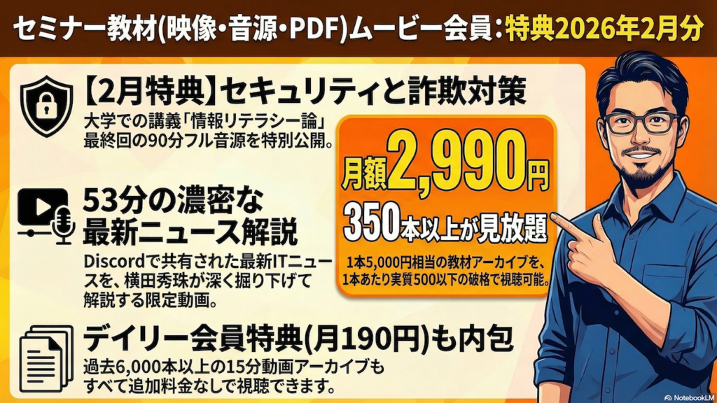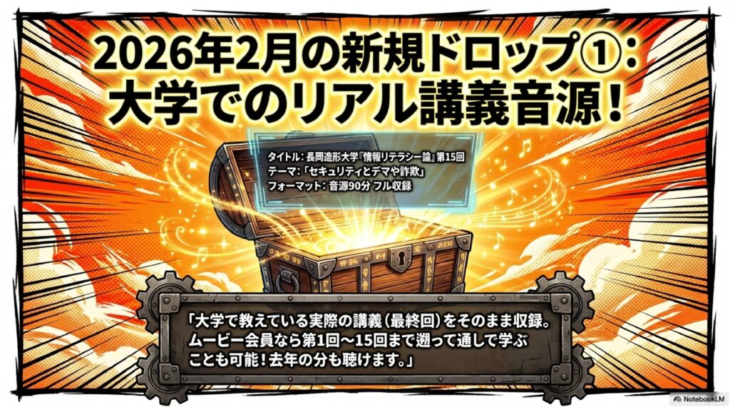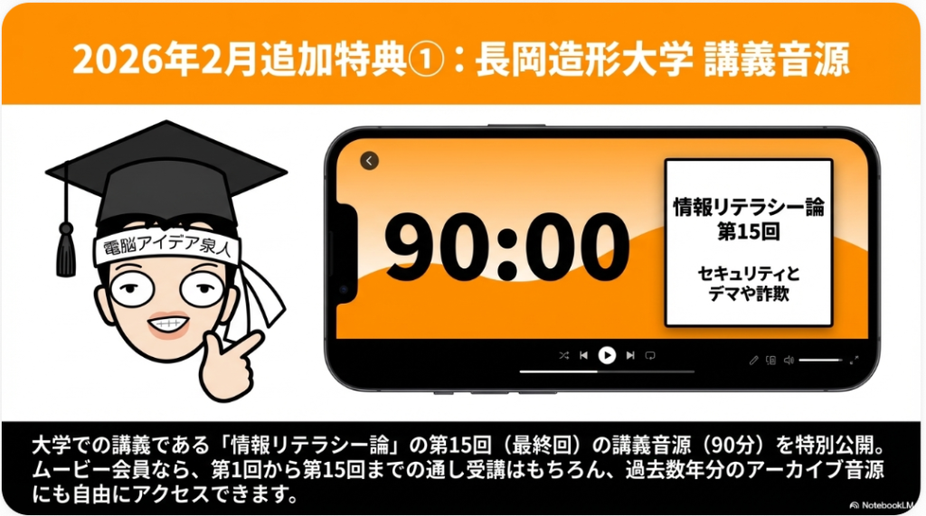 🔐 情報リテラシー論 主宰者が長岡造形大学で教えている講義で、全15回構成です。2026年2月分のムービー会員特典として最終回「セキュリティとデマや詐欺」の90分音源が追加されました。過去の年度分もアーカイブとして遡って視聴でき、体系的に情報リテラシーを学ぶことができます。