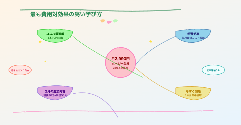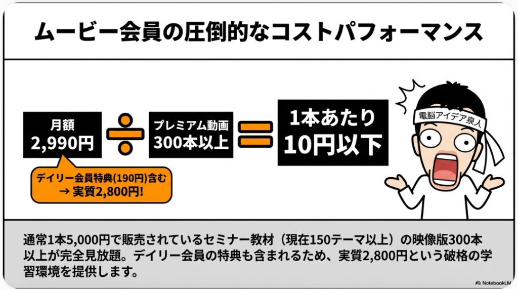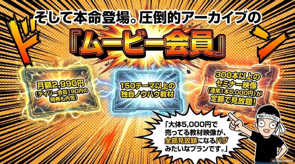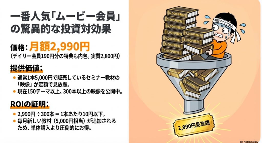 🎬 ムービー会員 月額2,990円のプランで、1本約5,000円で販売されているデジタル教材の映像部分が300本以上見放題になります。150テーマ以上の教材映像に加えデイリー会員の特典も含まれており、会員数が最も多い人気コースです。ただし音源やPDFは含まれない点に注意が必要です。