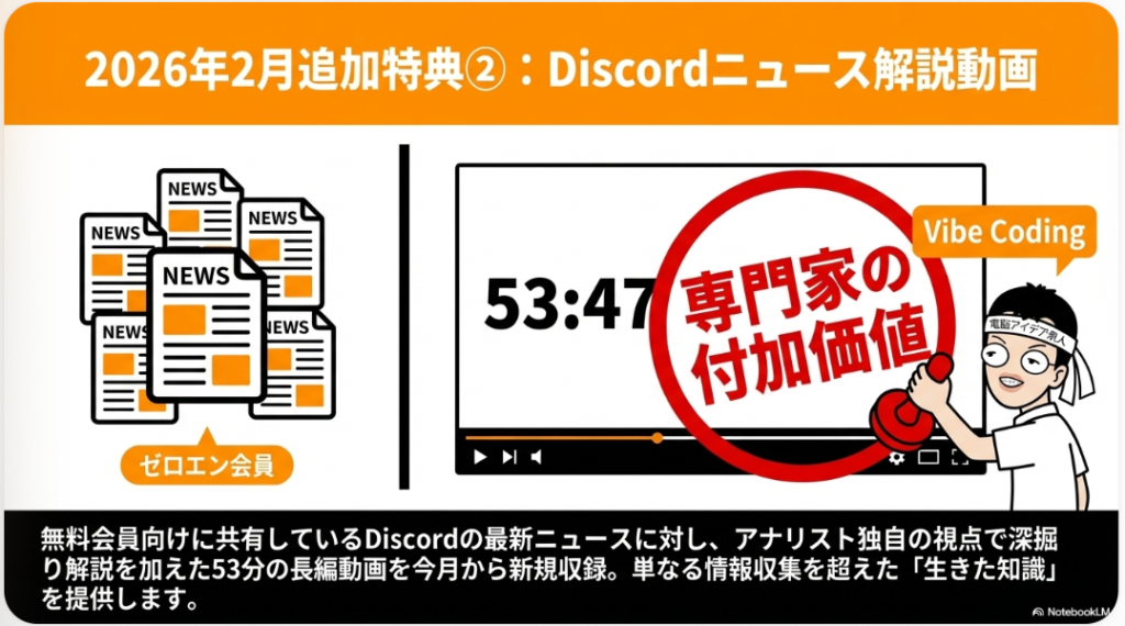 💬 Discord ネットビジネス研究会のコミュニティ基盤として利用されているチャットプラットフォームです。ゼロエン会員向けに無料のニュースやノウハウが日々共有されているほか、2026年2月からはDiscord投稿内容に主宰者が解説を加えた約53分の動画がムービー会員特典として追加されました。
