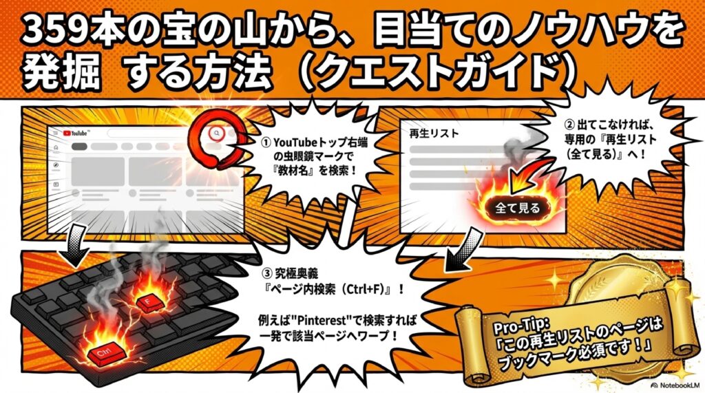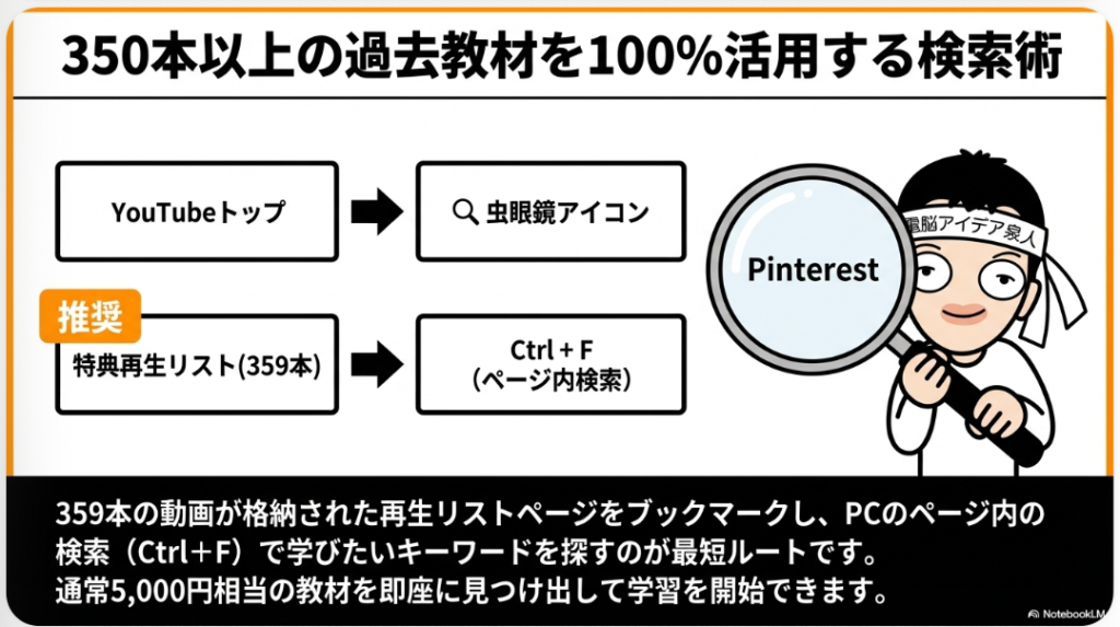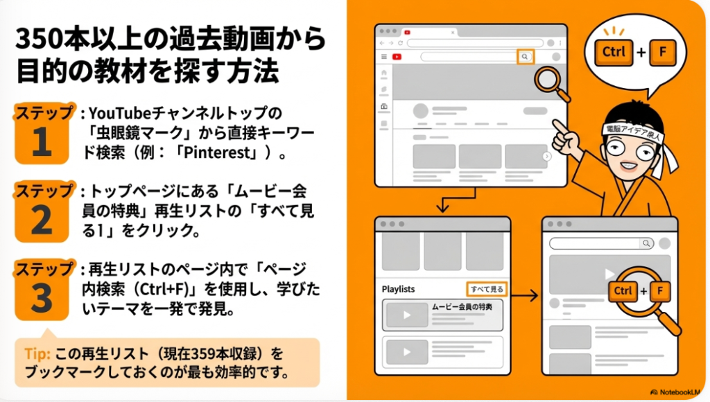 A5. 主に3つの方法があります。①YouTubeチャンネルのトップページにある虫眼鏡マークから教材名を検索する方法、②チャンネルトップページに表示されている「ムービー会員特典の再生リスト」から新しい順に探す方法、③再生リストのページで「Ctrl+F」(ページ内検索)を使ってキーワードで探す方法です。再生リストには現在359本の動画が収録されていますので、再生リストのページをブックマークしておくと、いつでもすぐにアクセスできて便利です。