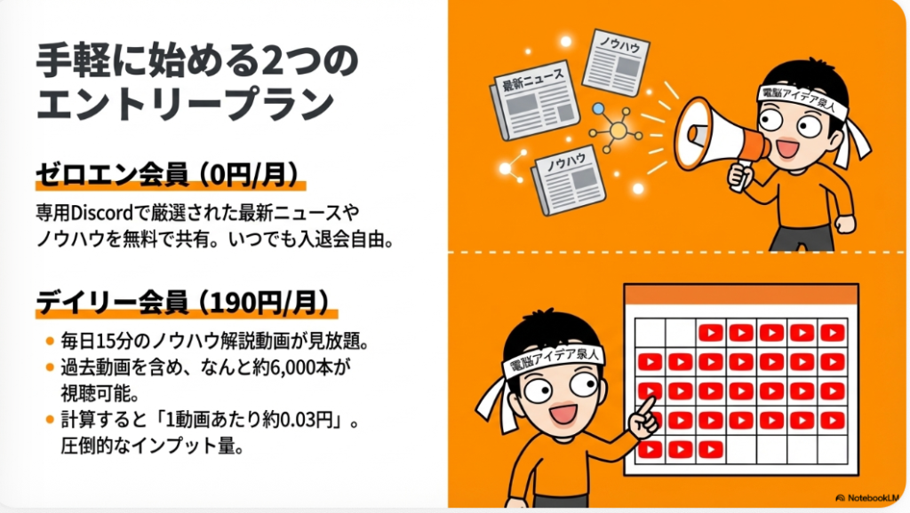 🆓 ゼロエン会員 月額0円で参加できる無料プランです。Discordコミュニティ上で、世の中のニュースや他者が無料公開しているノウハウを収集・シェアする形で情報提供が行われています。主宰者自身のオリジナルノウハウではなく外部情報の共有が中心のため、無料で提供されています。