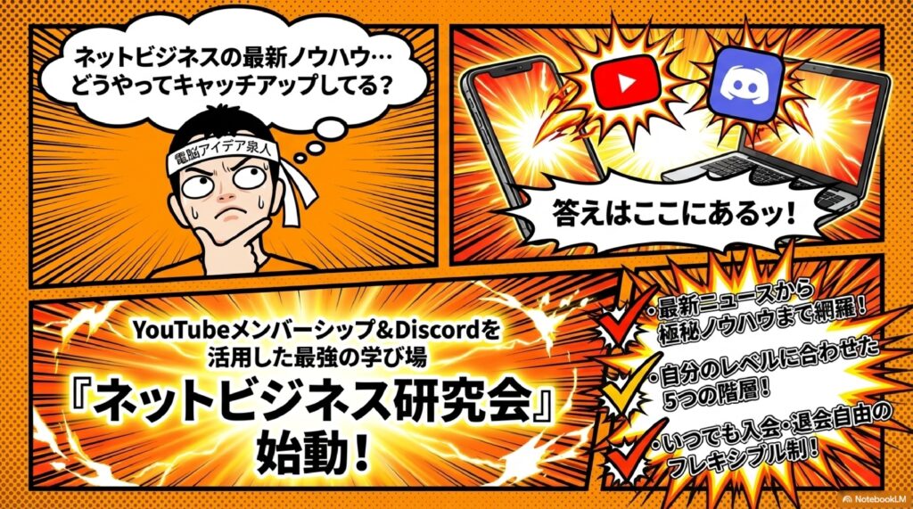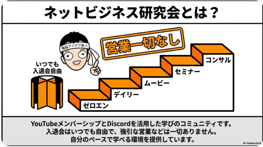 🏢 ネットビジネス研究会 YouTubeのメンバーシップ機能を活用して運営されているオンラインコミュニティです。マーケティング、SEO、SNS、生成AIなど、インターネットを活用したビジネス全般のノウハウを段階的に学べる場として設計されており、無料プランから個別コンサルまで5つの会員ランクが用意されています。