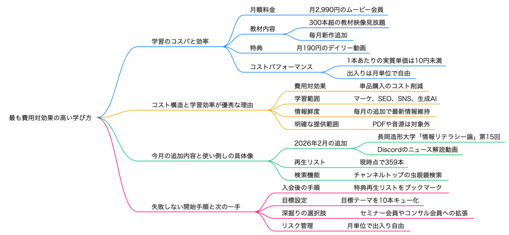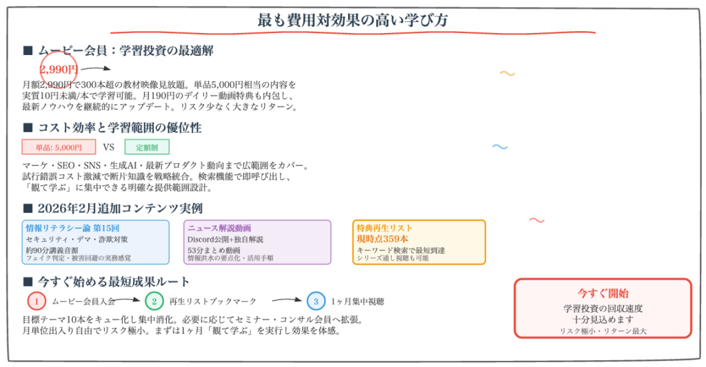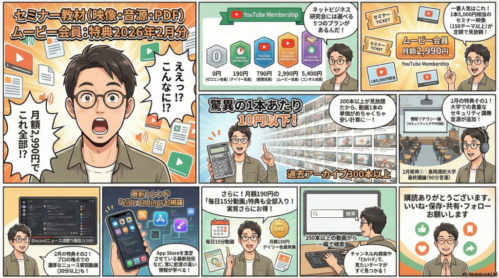 今回は、弊社で運営している「ネットビジネス研究会」の会員プランの全体像と、特に人気の高い「ムービー会員」の2026年2月分の新着コンテンツについてご紹介しました。ネットビジネス研究会は、無料のゼロエン会員から月5,400円のコンサル会員まで、5段階のプランが用意されているため、自分の学習スタイルや予算に合わせて最適なプランを選ぶことができます。中でもムービー会員は月2,990円で300本以上の教材映像が見放題というコストパフォーマンスの高さが魅力で、実際に最も会員数の多いプランとなっています。今月は長岡造形大学の「情報リテラシー論」最終回の音源や、Discord公開情報を丁寧に解説した新企画の動画が追加されるなど、ますますコンテンツが充実してきています。ぜひこの機会にネットビジネス研究会への入会をご検討いただき、日々進化するネットビジネスの知識をお得に学んでいただければ幸いです。
