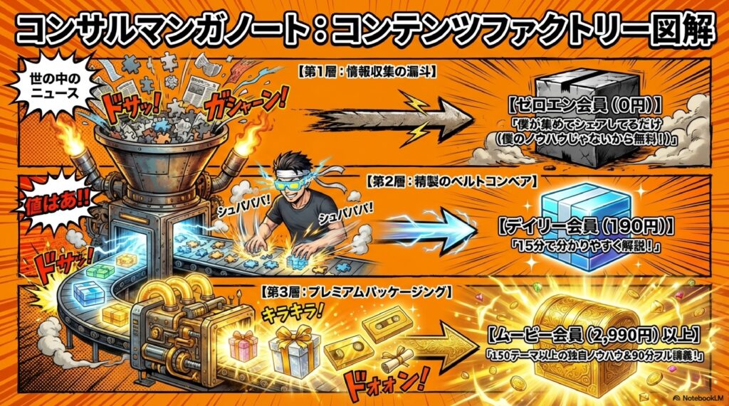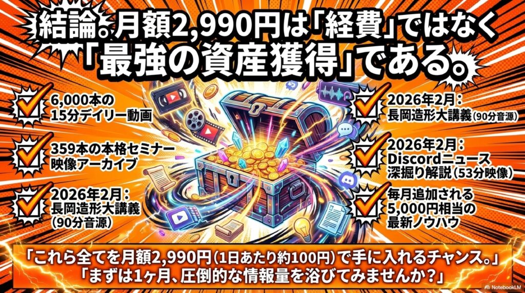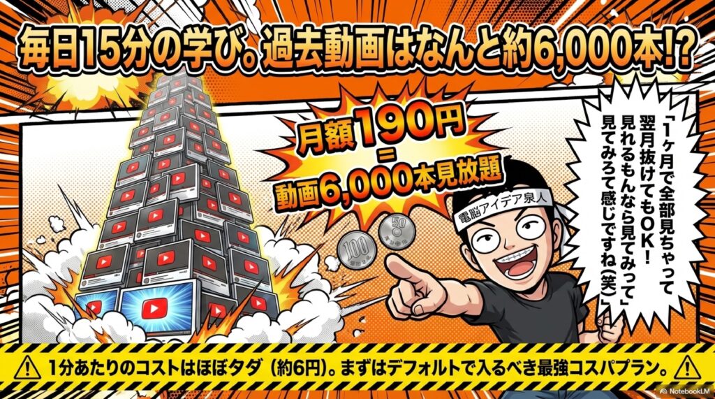 📅 デイリー会員 月額190円で参加できるプランで、毎日15分のビジネス解説動画が見放題になります。過去のアーカイブを含めると約6,000本の動画が視聴でき、1分あたり約6円という圧倒的なコストパフォーマンスが特徴です。YouTubeの仕組み上、会員への営業活動は一切行われません。