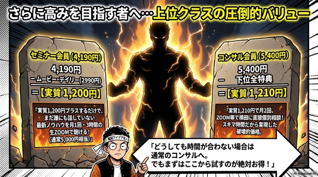 🤝 コンサル会員 月額5,400円の最上位プランで、月2回ZOOMなどによる個別アドバイスを30分間受けられます。主宰者のスケジュールの隙間時間を活用しているため低価格に設定されており、下位プラン全ての特典を含んでいるため、実質約1,210円で個別相談が受けられる計算になります。