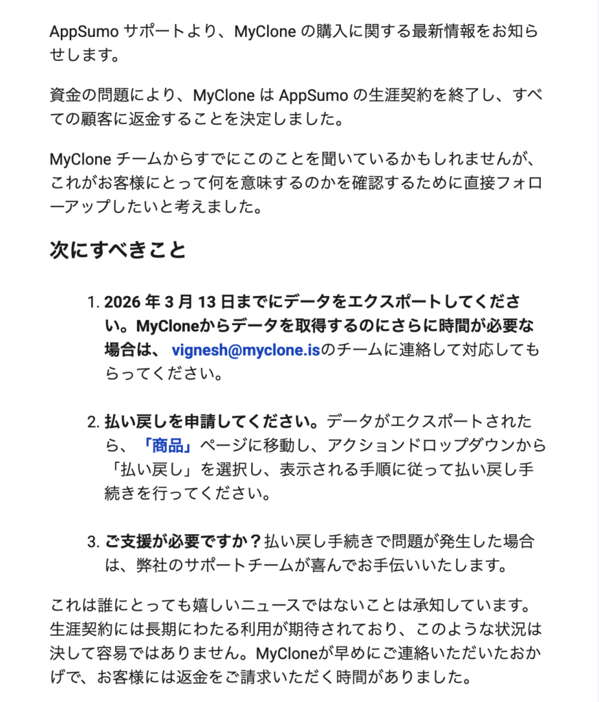 ここまで、AIクローンサービス「MyClone」について、その特徴から導入方法、詳細な設定まで包括的に解説してきました。改めて、このサービスの魅力をまとめてみましょう。MyCloneの最大の特徴は、音声とテキストの両方でリアルタイム対話が可能なAIクローンを作成できることです。しかも、サブスクリプション不要の買い切りプランで、現在は特別に半額の79ドルから購入できます。日本円で約1万2,640円という価格は、永続的に使えるツールとしては極めて高いコストパフォーマンスです。60日間の返金保証もあるため、リスクなく試すことができます。日本語対応が実現したことで、日本市場でも十分に活用できるようになりました。カスタマーサポート、リード獲得、予約管理、さらには収益化まで、様々なビジネスシーンで活用できる可能性を秘めています。まだ多くの人が知らないレア情報であり、早期導入者として競合に差をつけるチャンスです。2026年、AIをビジネスに導入することは、もはや「あったら良い」ものではなく「必須」になりつつあります。ぜひこの機会にMyCloneを導入し、あなたのビジネスを次のレベルへと引き上げてください。