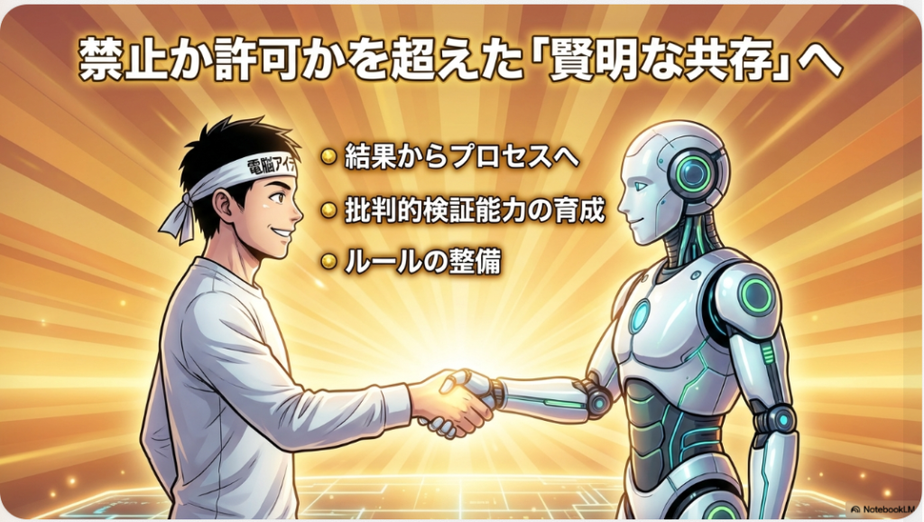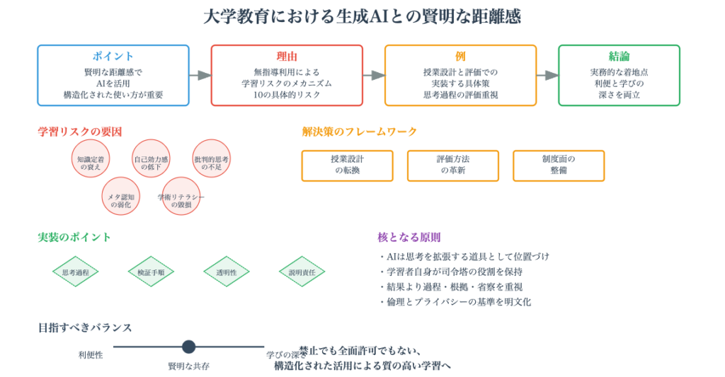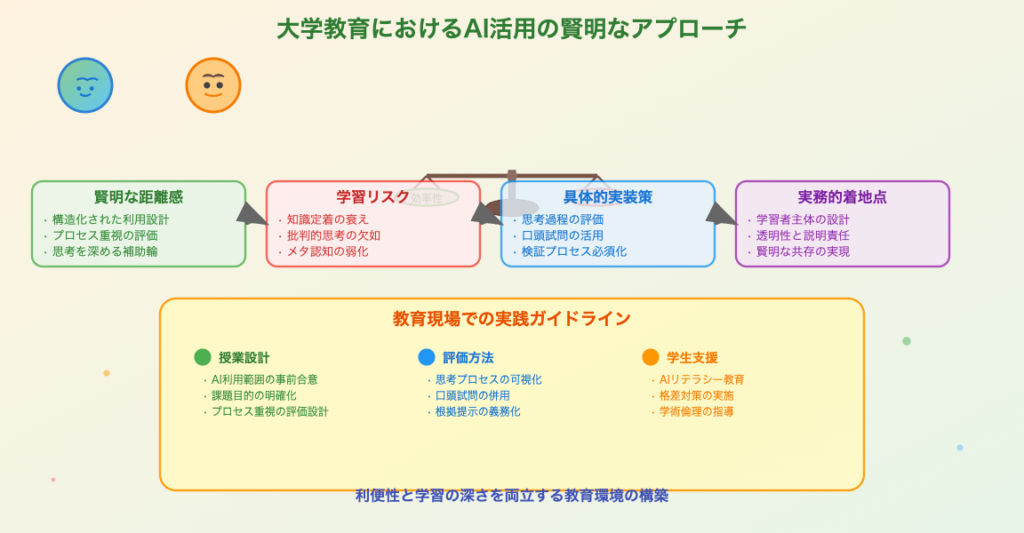 生成AIが学習に及ぼすリスクを踏まえたとき、教育機関がとるべき姿勢は「全面禁止」でも「無制限の許可」でもありません。問題の本質はAIという技術そのものではなく、それを無指導かつ結果偏重で利用する形態にあります。大学教育に求められるのは、AIの利用を前提としたうえで「思考の補助としてどう使うか」というプロセスを重視する方向へのシフトです。