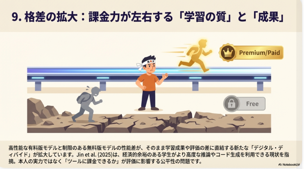 もうひとつの深刻な問題が、有料版と無料版の性能差に起因する「デジタル・ディバイド(デジタル格差)」の拡大です。Jin et al.(2025)の研究では、経済的に余裕のある学生が高性能な有料モデルを利用し、より高度な推論やコード生成の恩恵を受けている現状が指摘されています。学生本人の実力や努力ではなく、AIツールへの課金能力が学業成績に反映されてしまうのは、教育の公平性という観点から看過できません。大学としては、全学生に同等のAIアクセス環境を提供するか、AI利用の前提に依存しない評価基準を設けるなどの対策が急がれます。