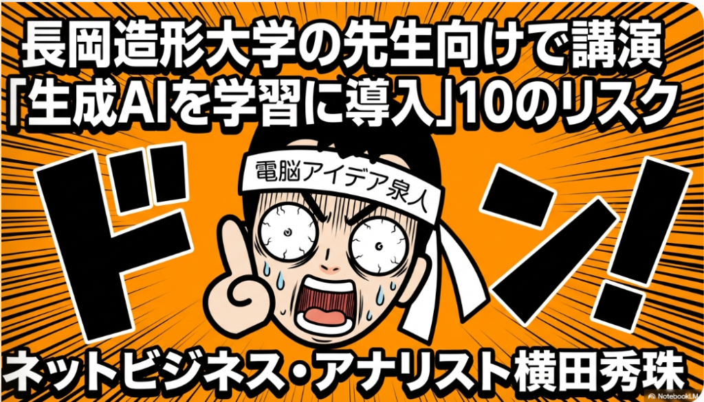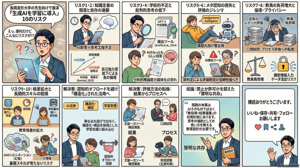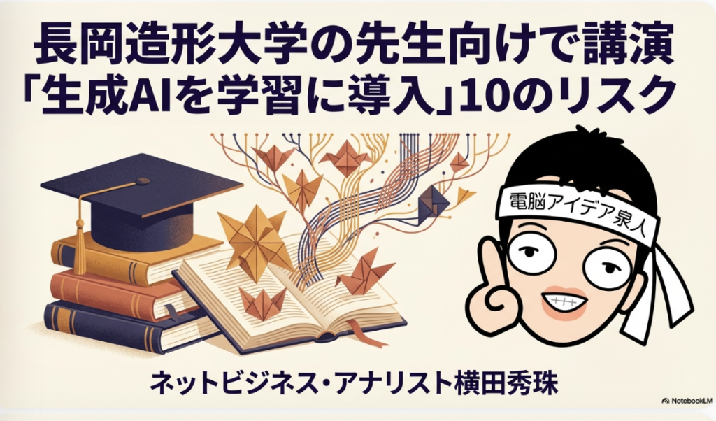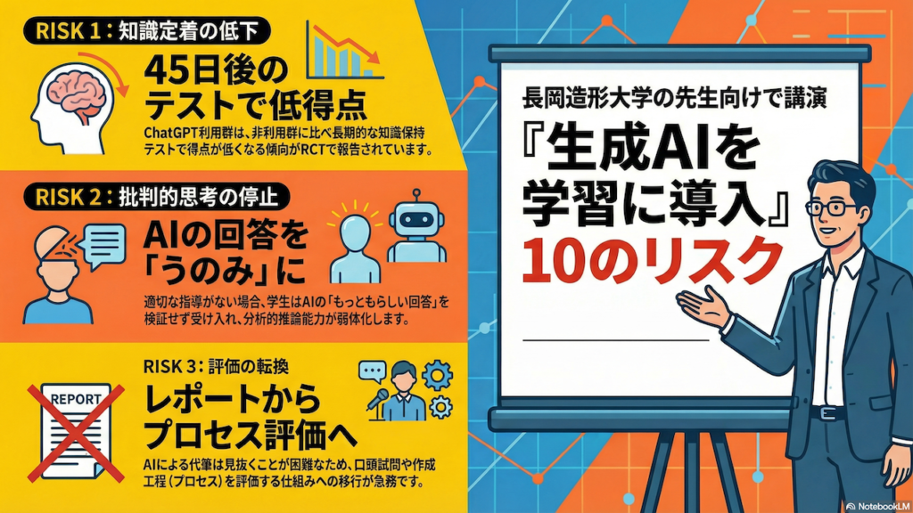 「AIに聞けばすぐ答えが出る時代」——そんな便利な世の中になった一方で、ふと立ち止まって考えたことはありませんか? 学生がレポートをAIに丸投げしている、自分の頭で考える力が弱まっている気がする……。そんな漠然とした不安を感じている教育関係者の方は、決して少なくないはずです。実際に世界中の研究者が、生成AIと学習の関係についてさまざまな実験や調査を行っており、その結果は私たちの直感を裏付けるものも多く含まれています。本記事では、新潟県の長岡造形大学で大学の教員向けに行われた講義の内容をもとに、生成AIが学習に及ぼす10のリスク要因を丁寧に解説していきます。NotebookLMのディープリサーチを活用して集めた世界の研究論文のデータも交えながら、「AIをどう使うか」を一緒に考えるきっかけにしていただければ幸いです。