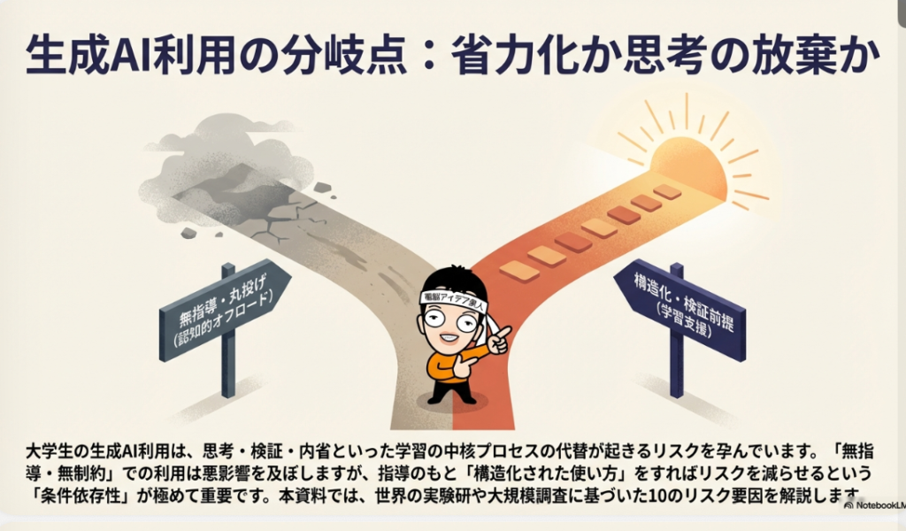 大学生の生成AI利用は、利便性の一方で学習の中核プロセス——つまり思考・検証・内省——を代替してしまうことがあり、それが起きると知識の定着や批判的思考に悪影響が生じ得ます。ただし、ここで重要なのは「条件依存性」という考え方です。無指導・無制約の利用はリスクを高めますが、構造化された使い方であれば悪影響を減らし得るのです。今回のスライドでは、実験研究・大規模調査・系統的レビューに基づき、10のリスク要因を解説していきます。