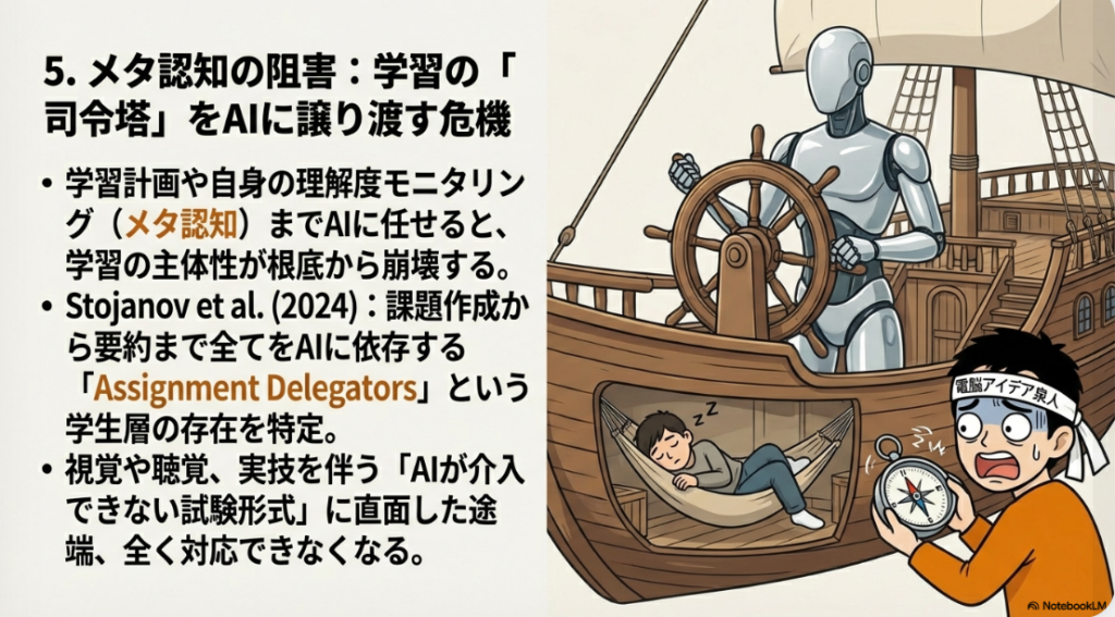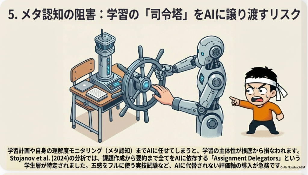 リスク5:メタ認知の阻害——学習の「司令塔」をAIに譲り渡すリスク