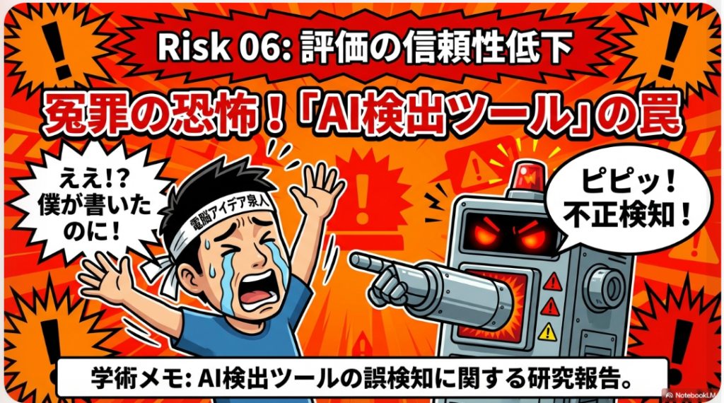 🚨 学術不正 生成AIは毎回オリジナルな文章を生成するため、従来のコピペチェックツールでは検出が困難です。Scarfeらの実験ではGPT-4で作成した提出物が高確率で検出をすり抜けたと報告されています。さらにAI検出ツールには偽陽性・偽陰性の問題もあり、不正を見逃すリスクと無実の学生を疑うリスクの両方が評価制度への信頼を揺るがしています。