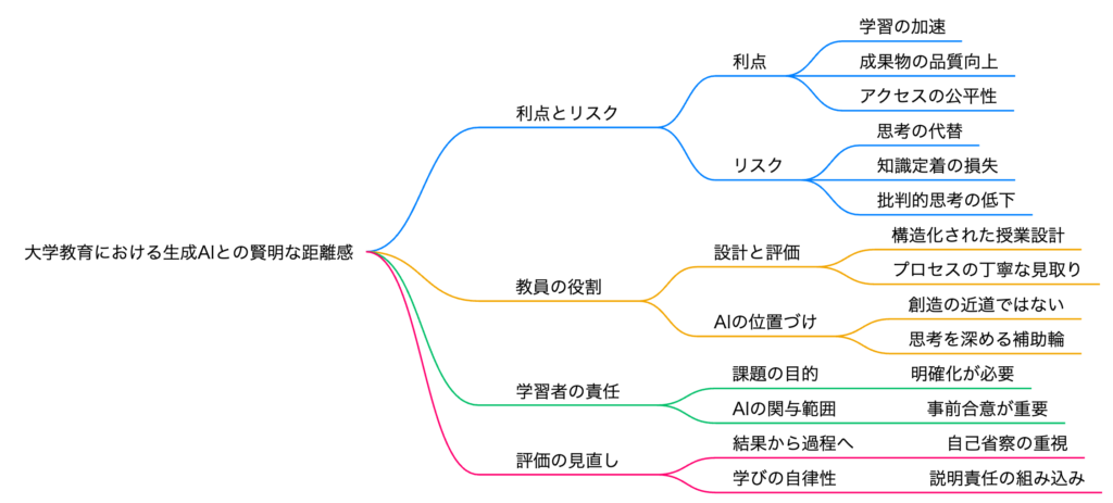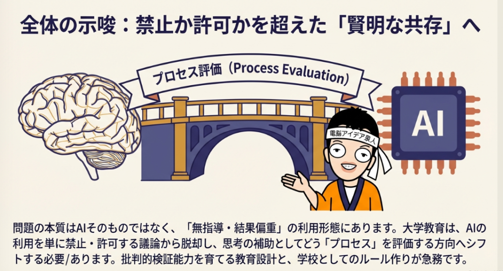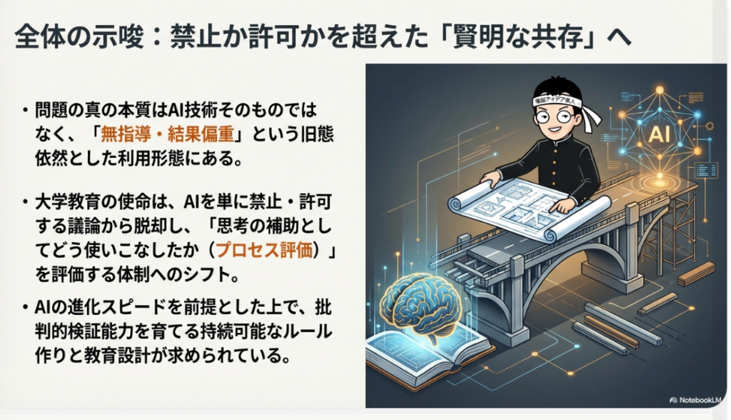 大学教育は、AIの利用を単に禁止・許可するのではなく、思考の補助としてどう使うか——つまりプロセス評価——を重視する方向へシフトする必要があります。批判的検証能力を育てる教育設計が求められています。