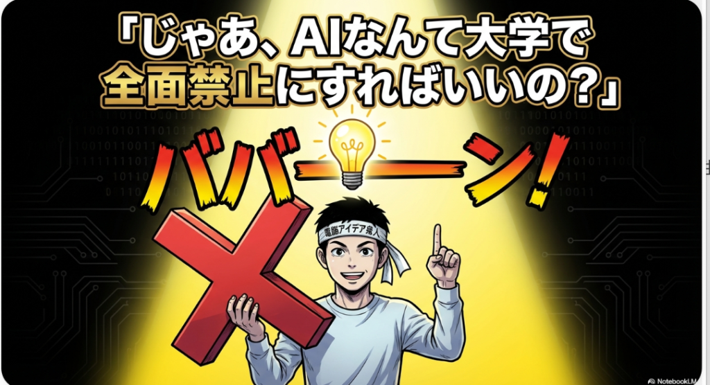 🤝 賢明な共存 問題の本質はAIそのものではなく「無指導・結果偏重」の利用形態にあるという考え方です。大学教育はAIの利用を単に禁止・許可するのではなく、思考の補助としてどう使うかを教え、批判的検証能力を育てる教育設計へシフトする必要があります。AIの進化に追いつくためにも、学校として体制やルールを整えていくことが急務です。