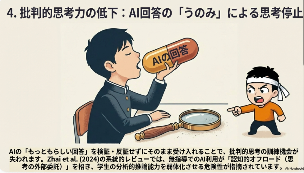 生成AIの回答はしばしば非常にもっともらしく、論理的に整った文章で提示されます。しかし、そのもっともらしさこそが批判的思考力の低下を招く原因となっています。Zhai et al.(2024)の系統的レビューでは、無指導のAI利用が「認知的オフロード」を促進し、学生の分析的推論能力を弱体化させる可能性が指摘されています。