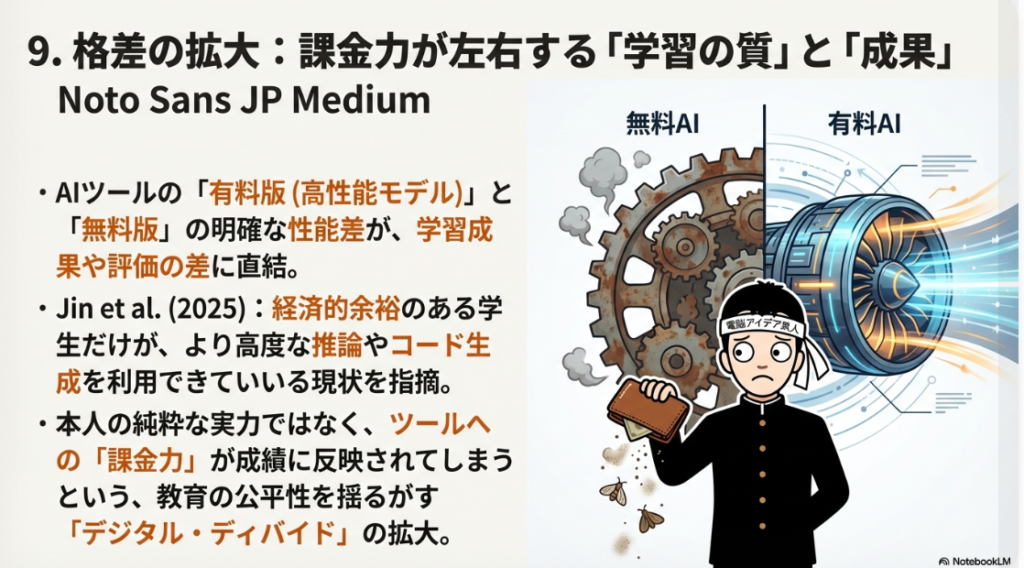 Jin et al.(2025)は、経済的余裕のある学生がより高度な推論・コード生成を利用できる現状を指摘しています。本人の実力ではなく、ツールに課金できるかどうかが評価に反映されてしまうのは公平性の問題ですよね。