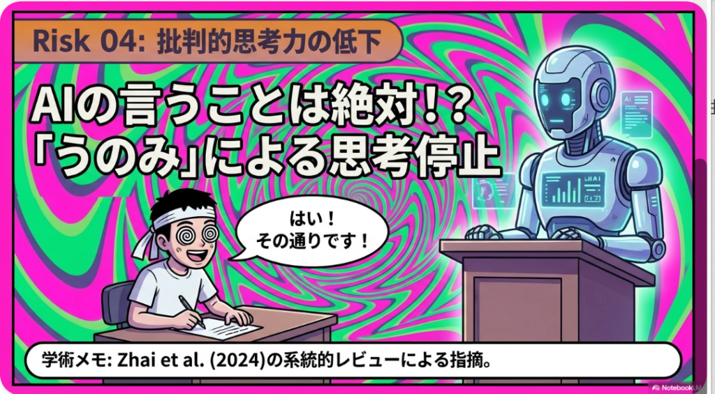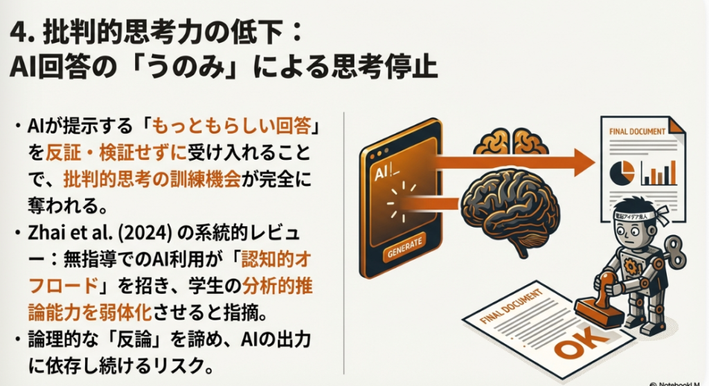 AIの「もっともらしい回答」を検証・反証せずに受け入れることで、批判的思考の訓練機会が失われます。これは教育において非常に深刻な問題です。
