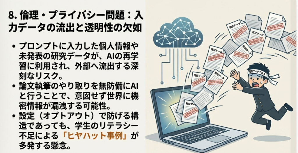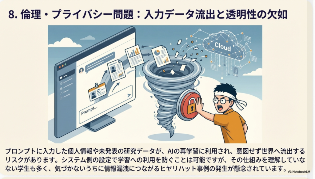 🔒 プライバシーリスク 生成AIに入力した個人情報や未発表の研究データが、AIの再学習に利用されて意図せず外部に流出する危険性があります。これから発表する論文の内容をAIでやり取りすると世界に漏洩してしまう可能性があり、設定で防げる場合もありますが、学生が気づかないまま情報を入力してしまうヒヤリハット事例が懸念されています。