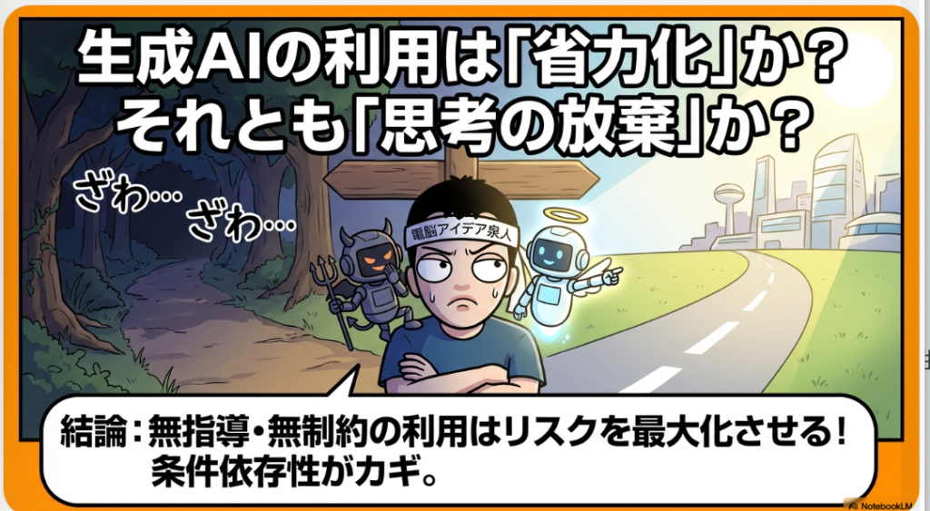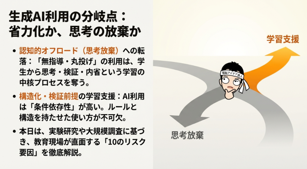 生成AIの教育利用を考えるうえで最も重要な視点が、利用の仕方によって結果が大きく変わるという「条件依存性」です。適切に構造化された使い方であれば学習の補助として機能しますが、無指導で丸投げ的に利用すると「認知的オフロード」と呼ばれる思考の外部委託に陥ります。認知的オフロードとは、本来自分の頭で行うべき記憶や思考の処理を、外部のツールに任せてしまう傾向のことです。