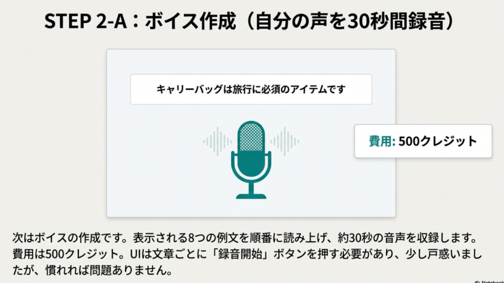A3. ボイス作成には500クレジットが必要で、8つのサンプル文章を読み上げて録音します。録音は1文章ずつ「録音開始」ボタンを押して行います。生成された音声は再生して確認でき、納得できたら確定して使用します。