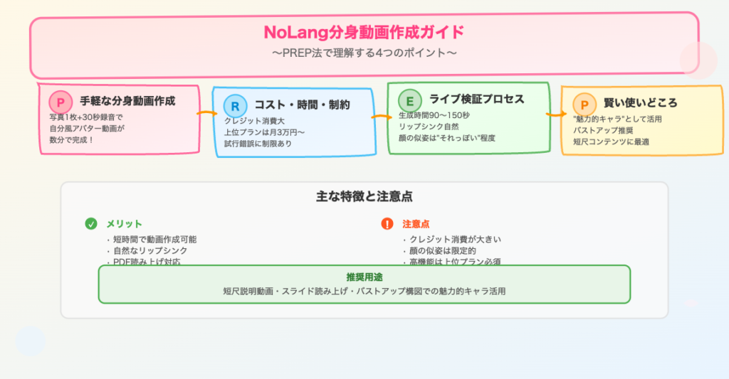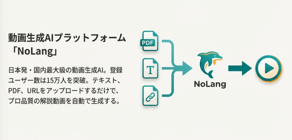 🎬 NoLang NoLangとは、テキストや画像から動画を自動生成できるAIサービスです。2024年11月25日に「キャラ作成」機能がリリースされ、ユーザーが自分のアバターや声を使った解説動画を作成できるようになりました。クレジット制で利用でき、プランによって使える機能が異なります。