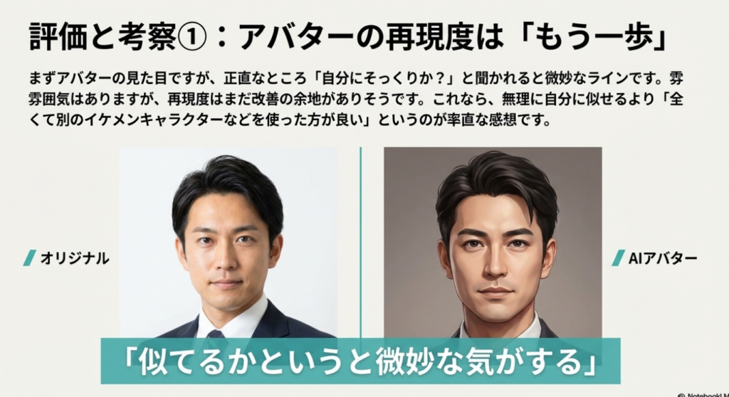 正直な感想としては、現時点では顔の再現度と声の再現度の両方において、まだ発展途上という印象を受けました。リアルな自分を再現するという目的であれば、もう少し精度の向上を待った方が良いかもしれません。一方で、自分に似せることにこだわらず、オリジナルのキャラクターとして活用するのであれば、現時点でも十分に楽しめる機能だと思います。