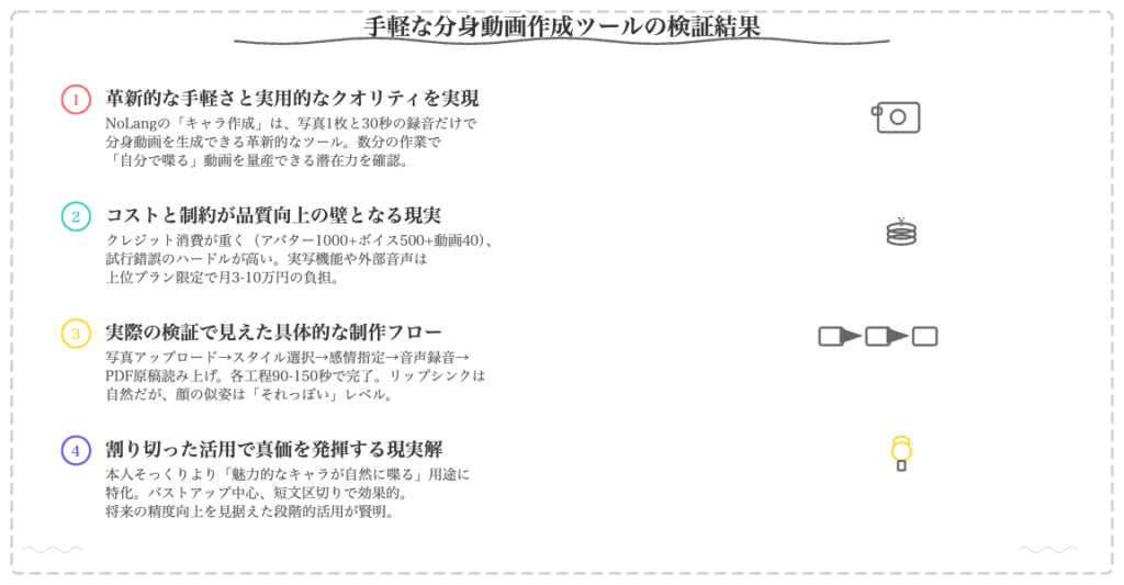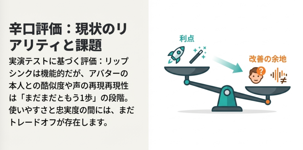 A5. 現時点では、顔の再現度と声の再現度の両方において発展途上という評価です。自分にそっくりなアバターを求める場合はもう少し精度向上を待つ方が良いでしょう。ただし、オリジナルキャラクターとして活用する場合や、自分に似せることにこだわらない使い方であれば、十分に楽しめる機能となっています。
