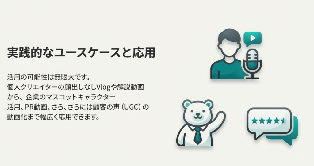 見た目のアバターと、声のクローン。この二つが組み合わさることで、動画制作の可能性は無限に広がります。具体的にどのようなことができるようになるのか、活用事例を見ていきましょう。
