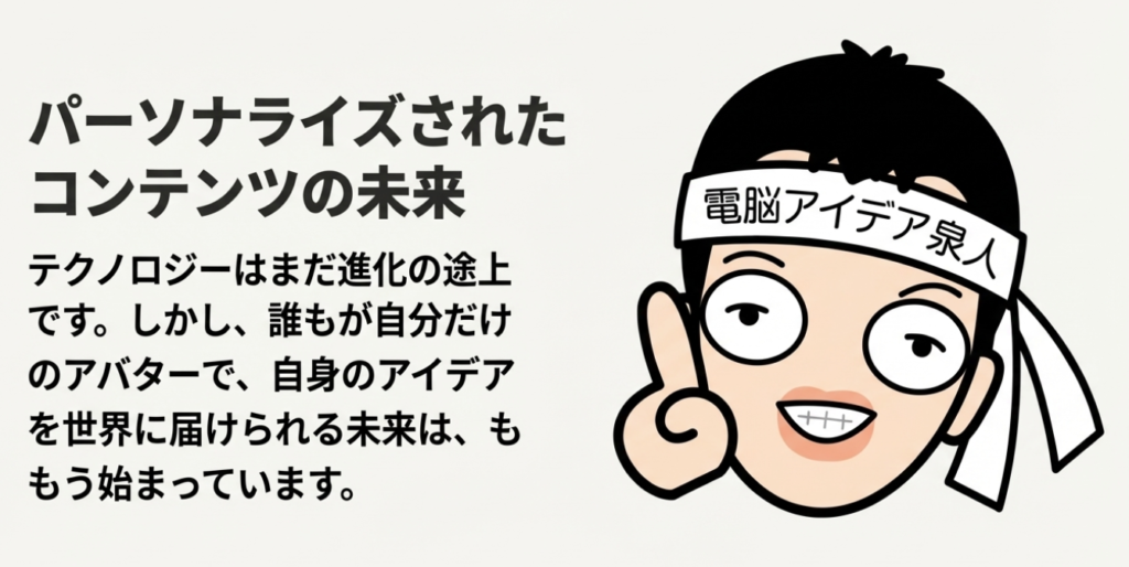 これらの技術は、もはや一部の専門家だけのものではありません。専門的なスキルや高価な機材がなくても、誰もが自分のアイデアを形にし、自分だけの分身(アバター)を通じて世界に情報を発信できる。そんな「誰もが表現者になれる時代」が、もう始まっているのです。もはや表現の質は、技術力ではなく、アイデアそのもので問われる時代になったのです。