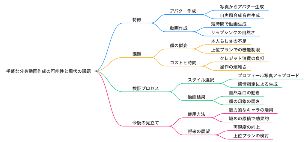 この機能では、自分の写真からアバターを作成し、自分の声を録音してそのアバターに喋らせることができます。アバター作成には約90秒から150秒、ボイス作成には8つのサンプル文章を読み上げる必要があり、全体で数分程度の作業時間が必要です。クレジット消費は、アバター作成に1000クレジット、ボイス作成に500クレジット、動画生成に40クレジット程度となっています。