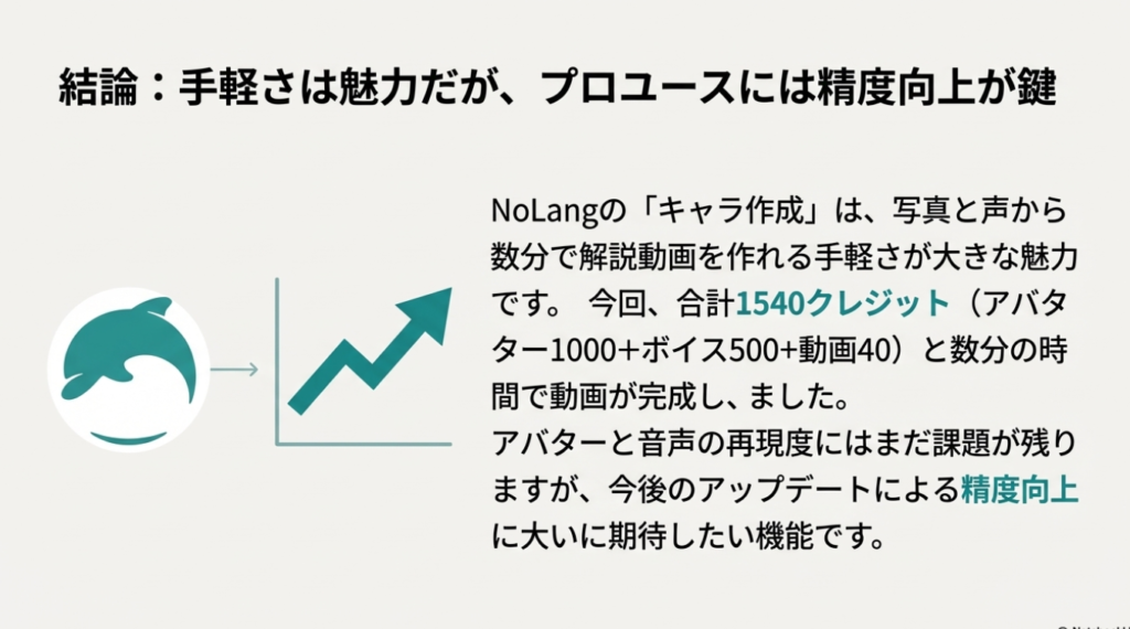 ということで、今日は動画生成AIのNoLangでキャラ作成でアバターやリアル人物の動画解説が可能になったということで、ライブ配信で生でお伝えしましたので、このぐらいの時間でできるということは分かっていただけたんじゃないかなと思いますので、ちょっとクレジット使いますけど、2回目はそんなにかからないので、ぜひよかったら作ってみてください。
