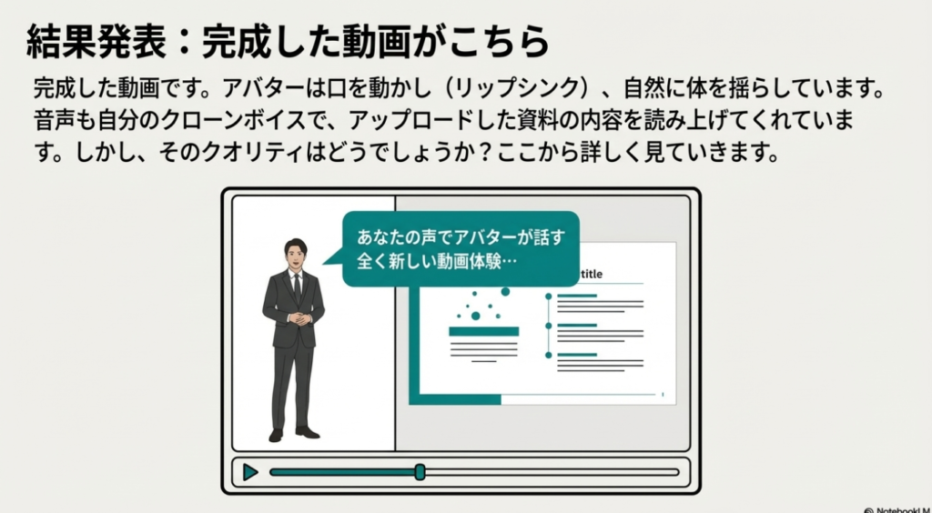 この技術の最大の利点は、一度自分の声のクローンを作ってしまえば、あとはテキストを入力するだけで、自分が話しているかのようなナレーションを無限に生成できる点にあります。もう、動画を作るたびに何度も録音する必要はありません。