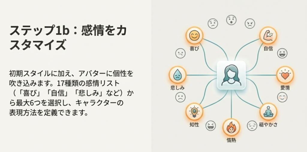 3. 感情の選択 最後に、完成したキャラクターに「喜び」「怒り」「悲しみ」といった感情表現を付与します。AIが提案する合計17種類の感情の中から最大6個を選ぶことで、セリフに合わせて表情豊かに話す、表現力豊かなアバターが完成します。