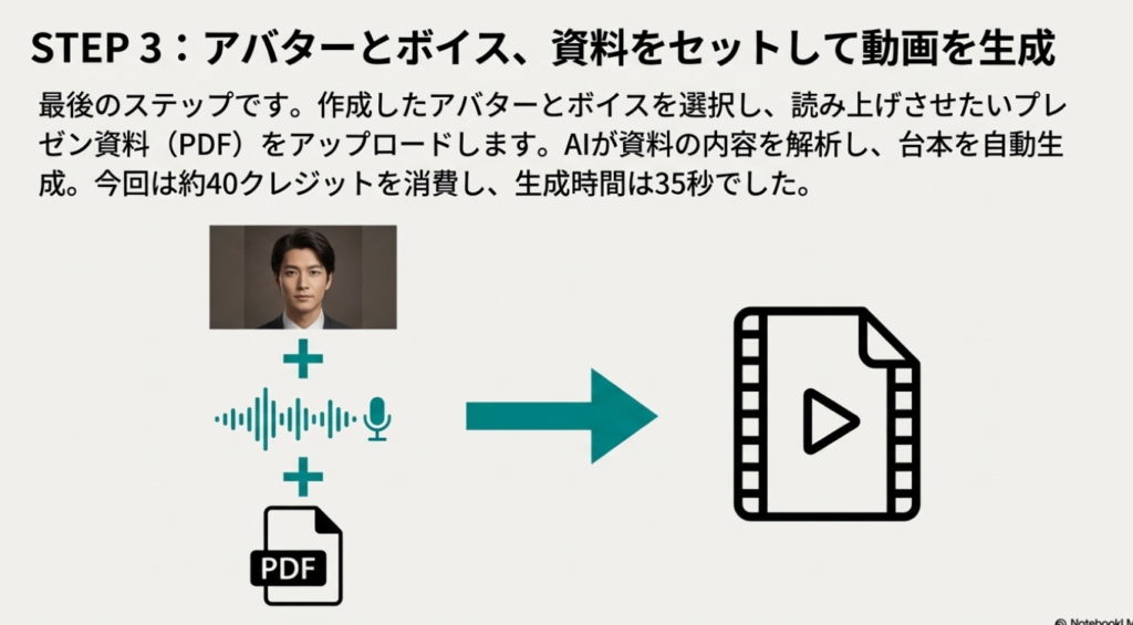 ⏱️ 生成時間 生成時間とは、AIがアバターや動画を作成するのにかかる処理時間です。アバター生成に約90秒、感情付きキャラクター生成に約150秒、動画生成に約35秒かかり、リアルタイム作業では待ち時間が発生します。