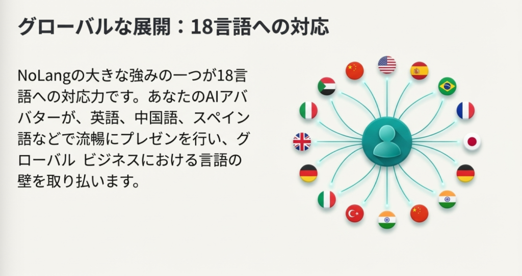 • 【企業のグローバル展開】言語の壁を超える 日本語のプレゼン資料さえあれば、自身のAIアバターはそのままに、ナレーションを英語や中国語など全18言語のネイティブな発音に自動変換した営業動画を即座に生成できます。これにより、海外出張や通訳にかかるコストを大幅に削減し、言語の壁を越えて世界中の顧客にアプローチする商談機会を創出します。