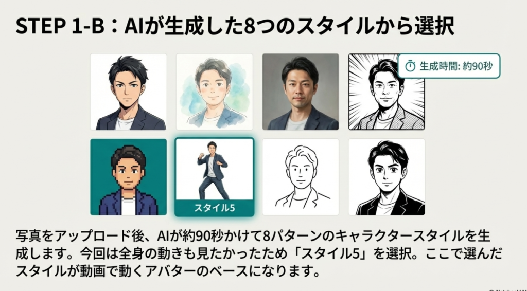 🎨 スタイル選択 スタイル選択とは、生成されたアバターの見た目を8パターンの中から選ぶ工程です。全身表示や上半身のみなど複数の構図があり、用途に応じて最適なスタイルを選択できます。後から変更することも可能です。