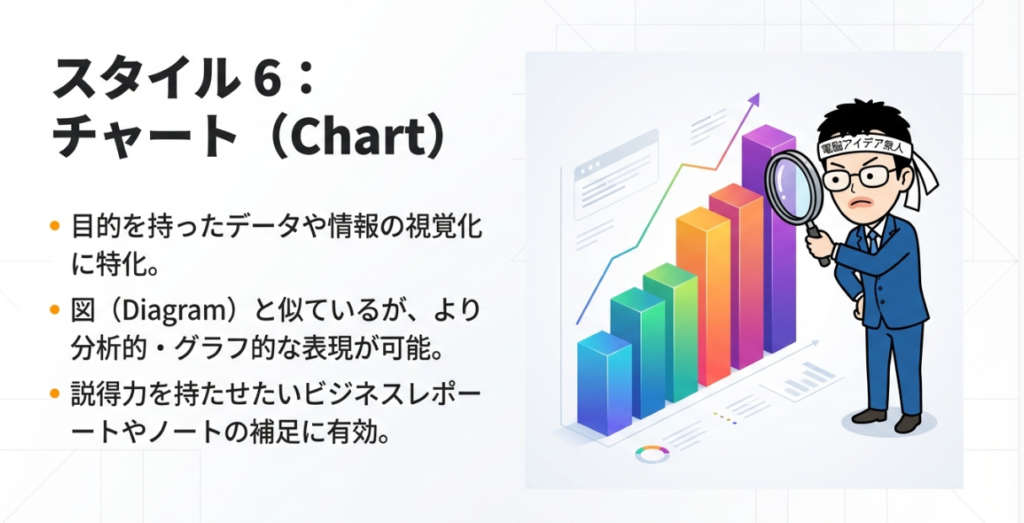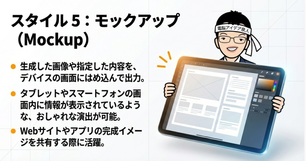 さらにチャートスタイルではグラフや表形式の画像が生成でき、モックアップスタイルではタブレットやスマートフォンの画面内にコンテンツが投影された形で出力されます。モックアップはアプリのUIイメージやWebサイトのプレビューを見せたい場面で効果的です。ビジネスの場面では、これら5つのスタイルを使い分けることで、報告書やプレゼン資料の視覚的な訴求力を大幅に高めることができるでしょう。