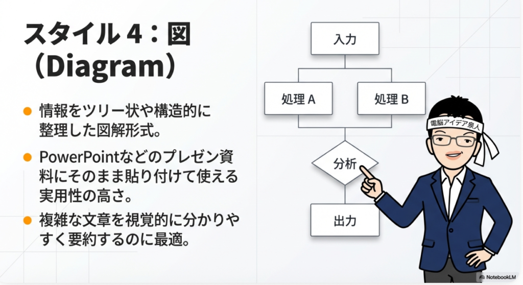 図解スタイルは、プロセスの流れや概念の関係性をツリー構造やフローチャート形式で表現してくれます。マニュアルやドキュメントの補足資料として挿入すれば、テキストだけでは伝わりにくい情報も一目で理解できるようになります。いずれのスタイルも日本語フォントに対応しており、テキストが崩れることなくきれいに表示される点も見逃せません。