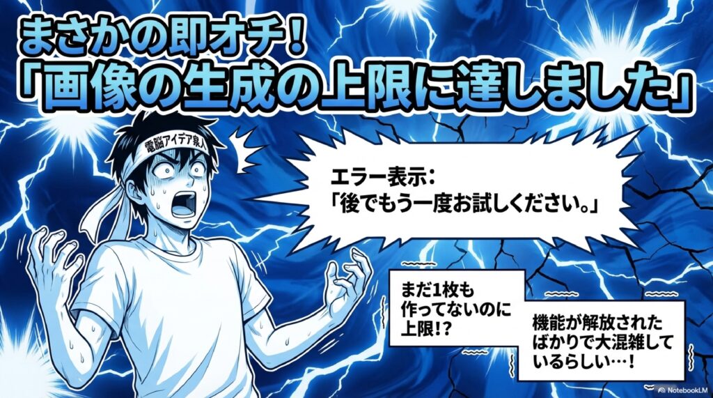 ただし、ここで一つトラブルが発生しました。送信したところ「画像の生成の上限に達しました。後でもう一度お試しください。」というメッセージが表示されてしまったのです。どうやらこの機能には1日の画像生成の上限があるようで、その上限に達してしまったため、今日はこれ以上作れないという状態になってしまいました。この制限は24時間以上待たないと解消されないようです。