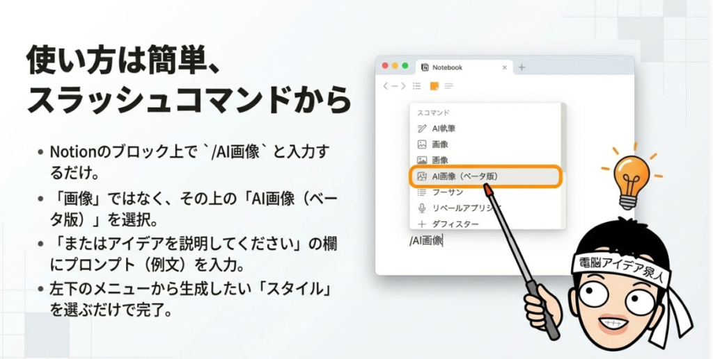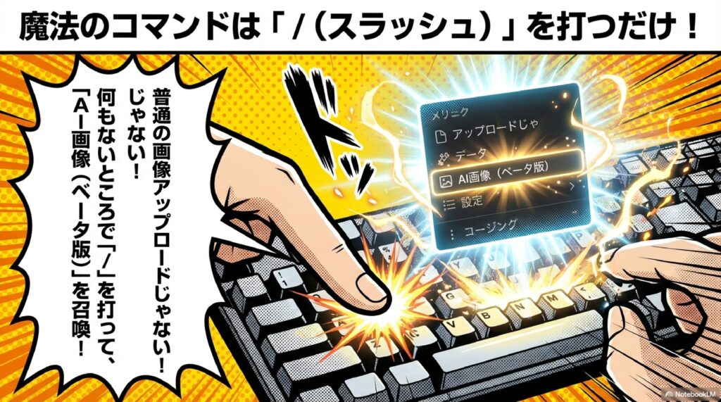 📝 スラッシュコマンド Notionで「/」を入力することで呼び出せる機能メニューのこと。AI画像機能もこのスラッシュコマンドから起動し、表示されたメニューで「AI画像」を選択して利用する。Notionの基本操作の一つであり、テキスト入力・ブロック追加・各種機能の呼び出しをキーボードだけで素早く行える仕組みである。
