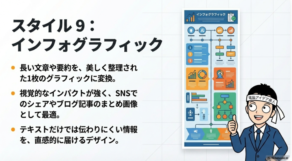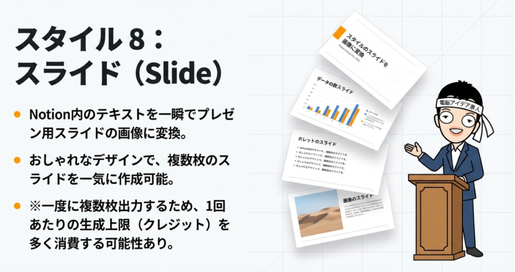 Notion AI画像の最大の魅力は、豊富な画像スタイルが用意されていることです。ビジネスシーンで特に重宝するのが、インフォグラフィック、スライド、図解の3つのスタイルです。これらは情報やデータを視覚的に分かりやすく整理する際に最適な形式です。