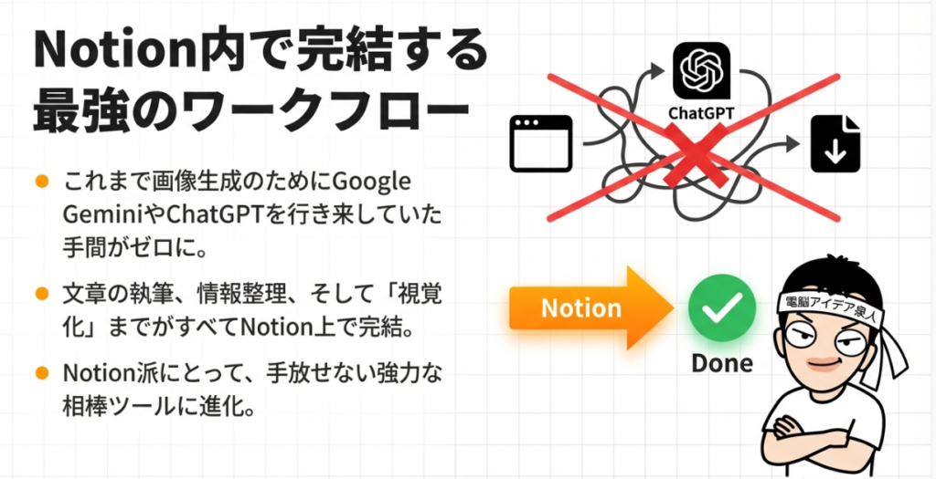 - Notion完結 ― わざわざGemini等の外部ツールに行かなくてもNotion内で画像生成